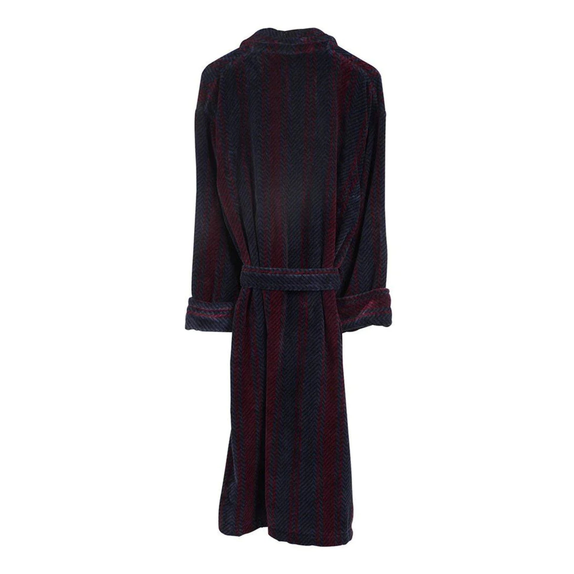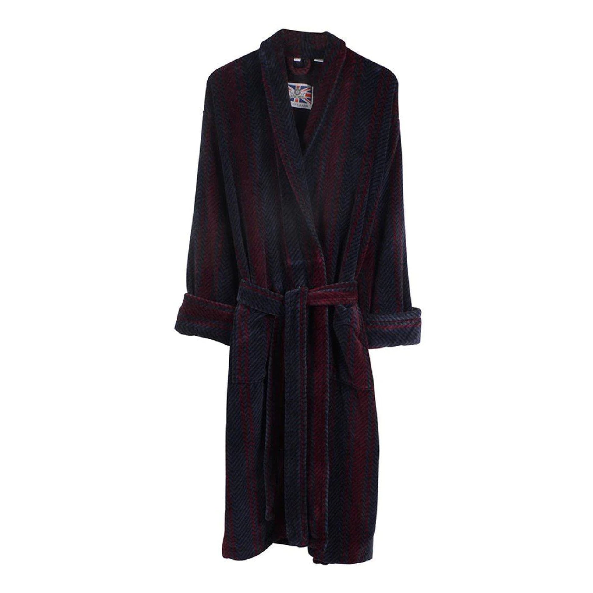 Experience the luxury and comfort of our Arbroath dressing gown, featuring a captivating navy and claret chevron design. This robe is designed to impress, with a plush half shawl collar, a matching tie belt, two generously sized front pockets, and fold back double cuffs.