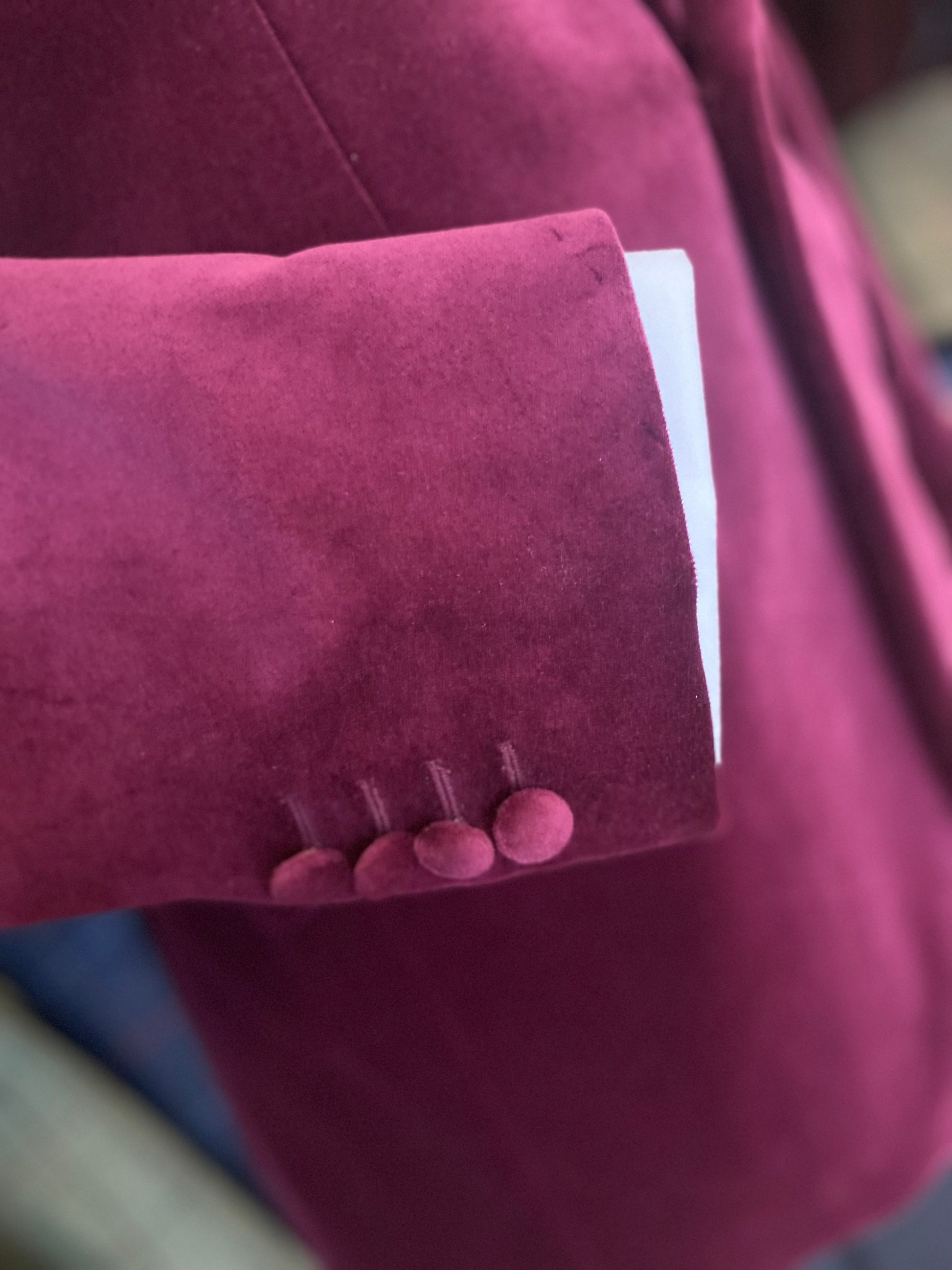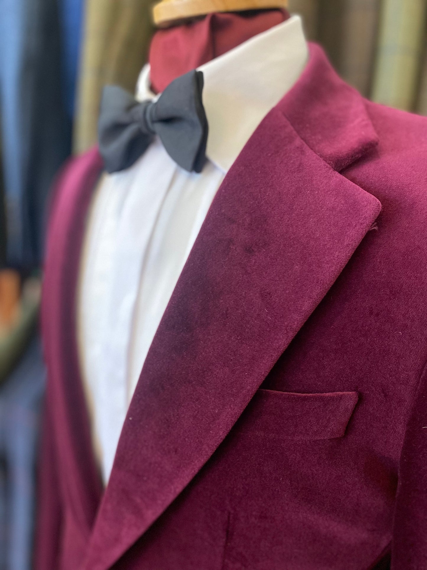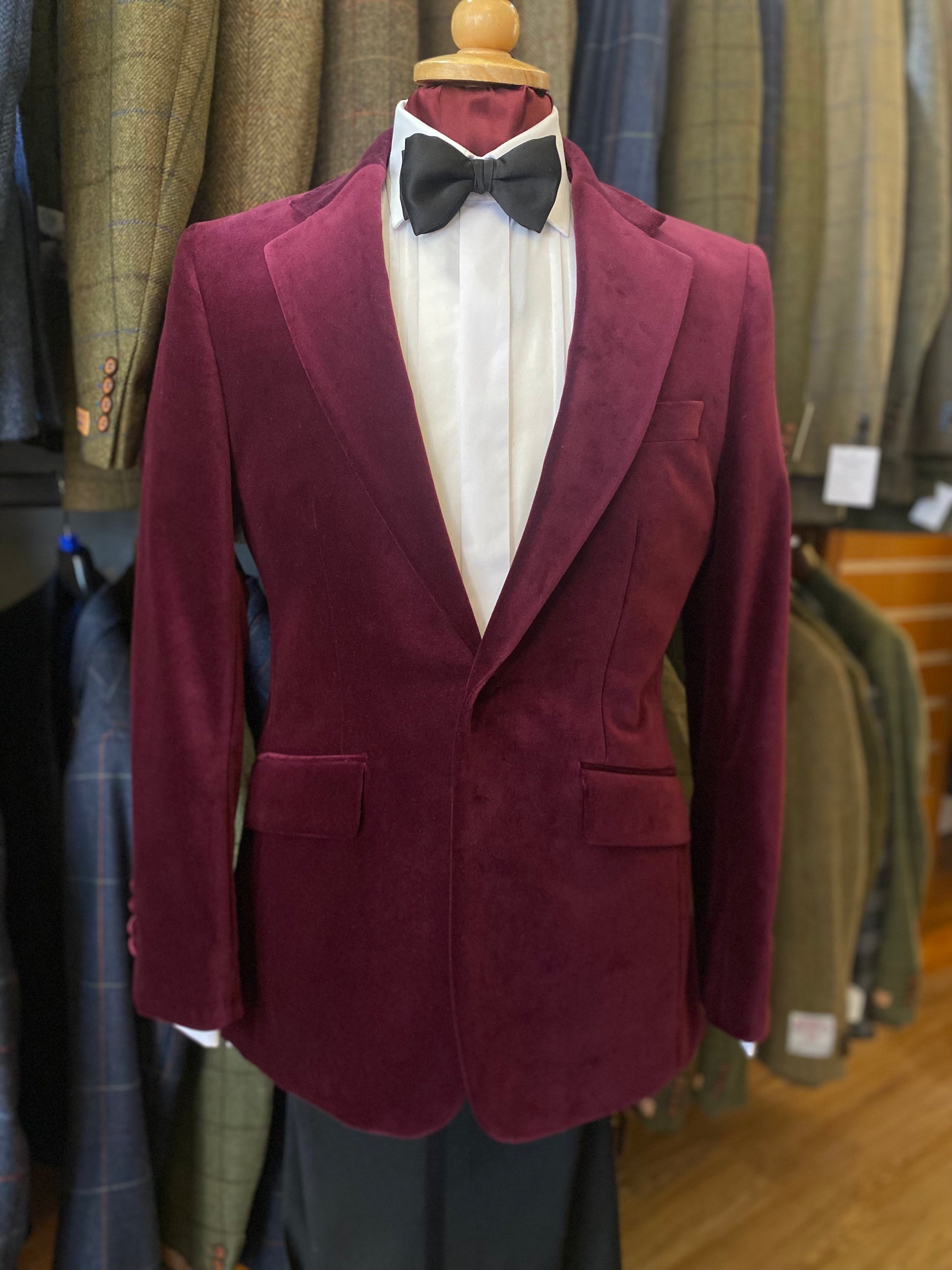Burgundy velvet dinner jacket without dinner facing which allows you to wear it as velvet day jacket also. Rear side vents, 2 side pockets