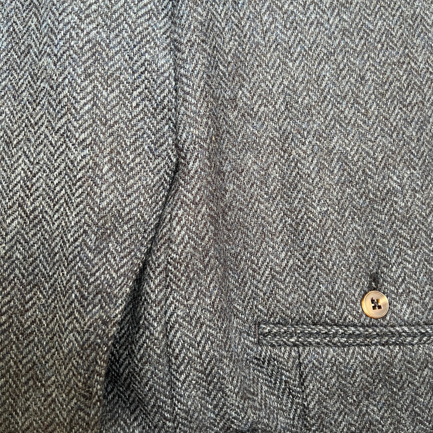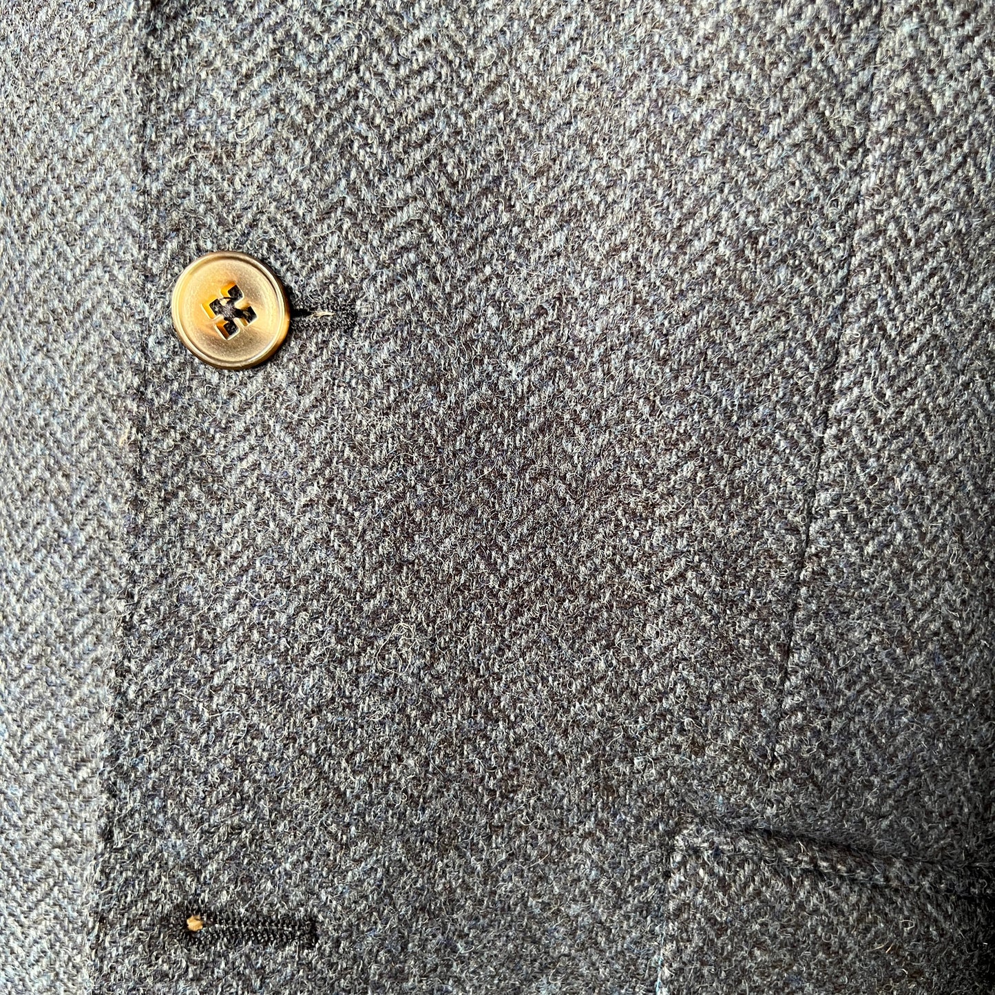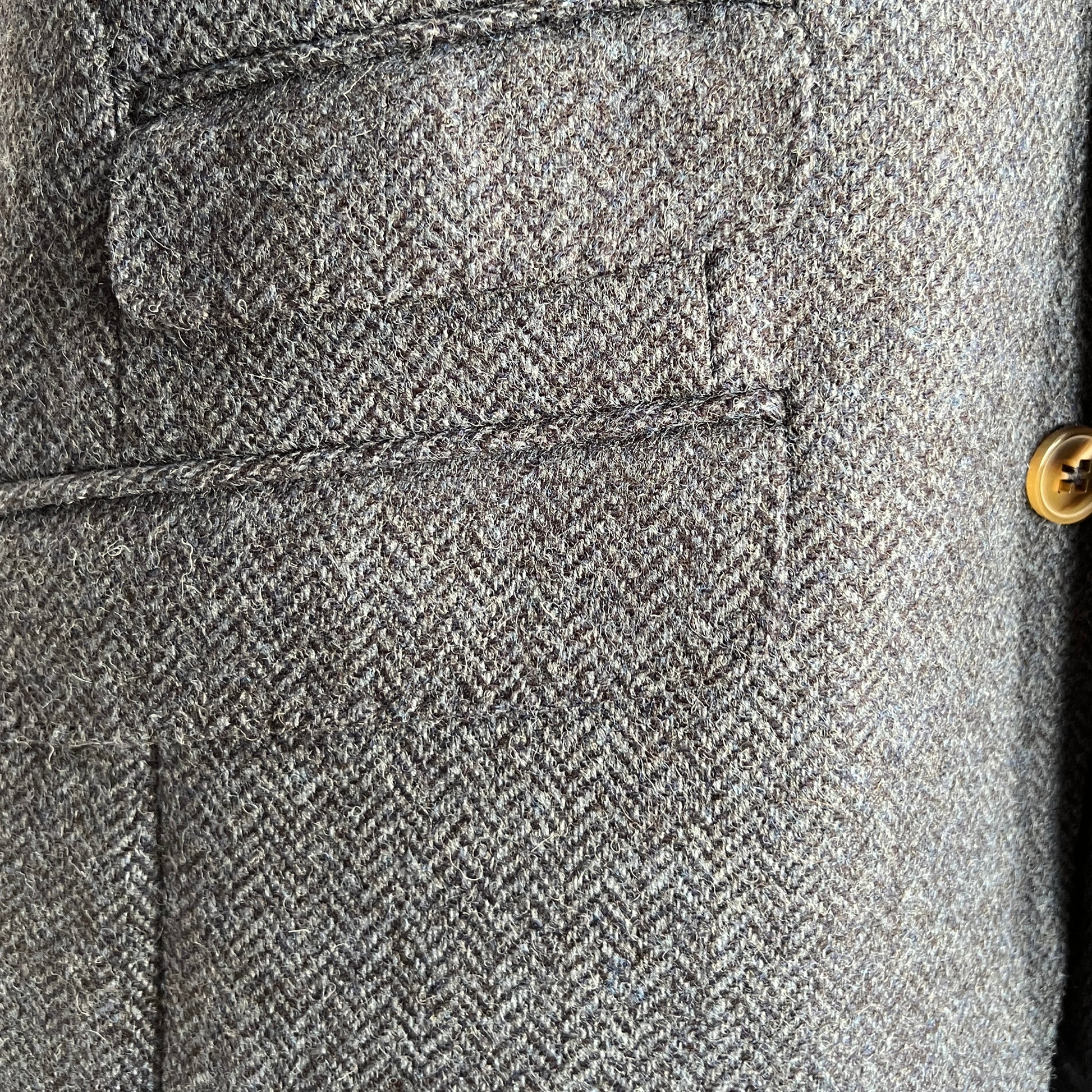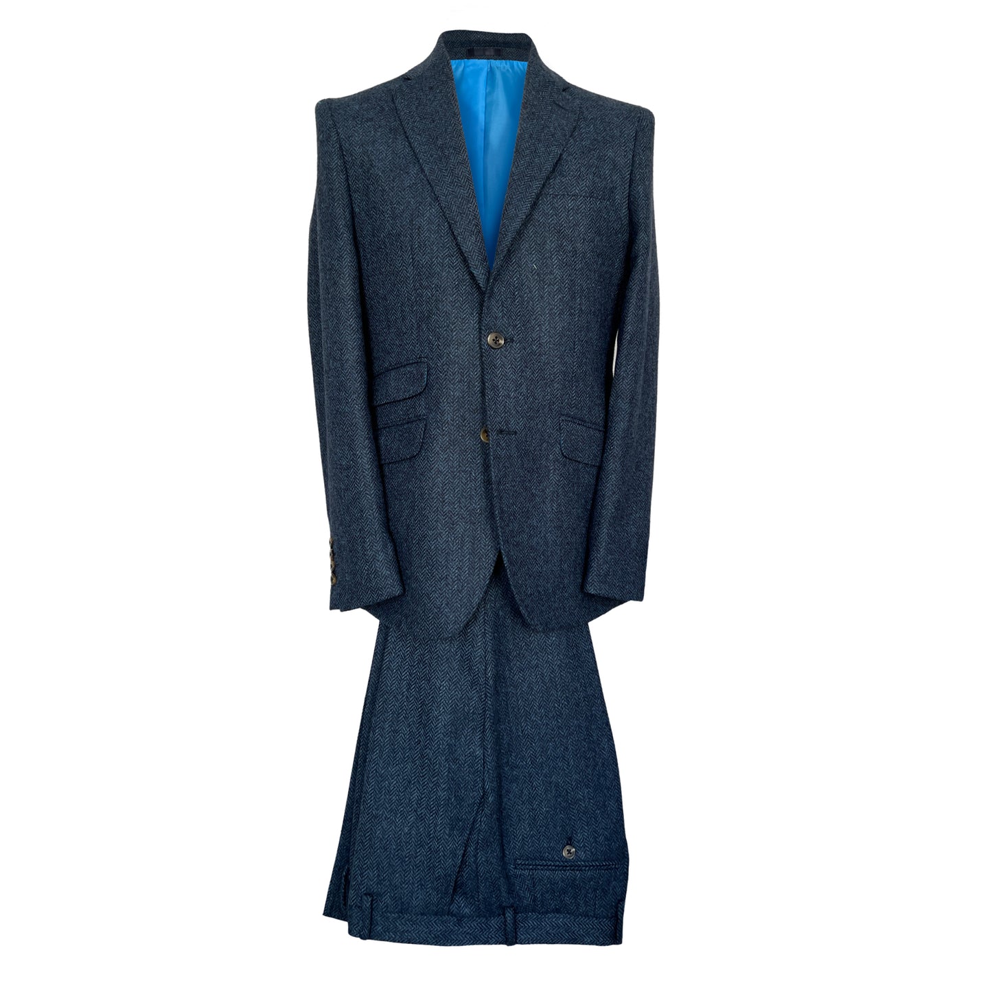 Our navy tweed suit is made from 100% English wool, woven by Abraham Moon & Sons, with a subtle herringbone pattern.