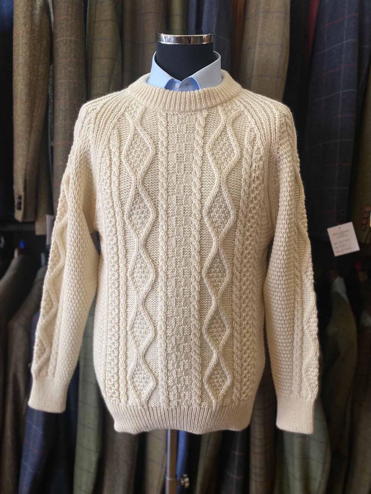 Beige, pure wool sweater, round neck with detailing
